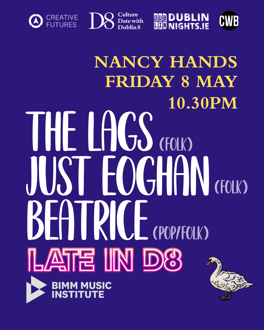 Settle in for a late-night session as Late in D8 continues with a special BIMM showcase at Nancy Hands on Friday 8 May. Starting at 10.30pm, this intimate gig brings together three emerging artists from BIMM Dublin, each offering their own take on contemporary folk and acoustic sound, right in the heart of Dublin 8.
